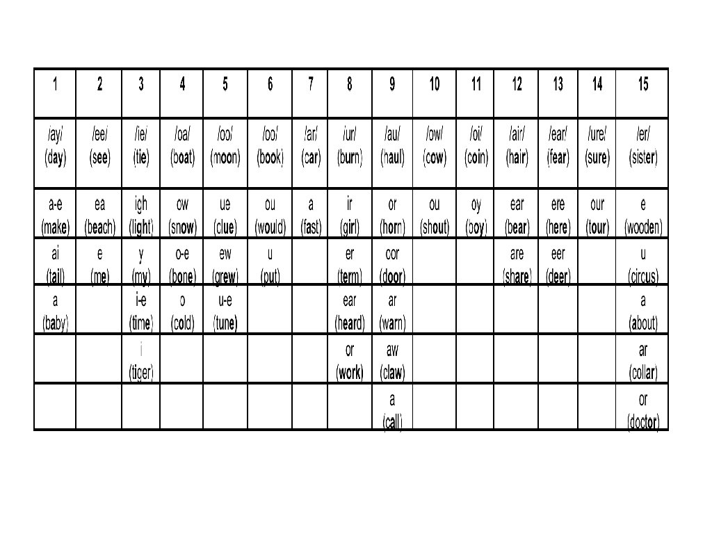 Long vowel phonemes • Which of these words contain long vowel phonemes? trail hope swan pay frog saw toy mouse fern • How many ways can you find to spell the phoneme /ee/ as in ‘green’? • The phoneme /ee/ (as in green) can be spelt in ten ways as follows: ‘ee’ `(seen), ‘ea’ (mean), ‘e’ (be), ‘ie’ (siege), ‘ei’ (deceive), ‘e-e’ (serene), ‘ey’ (key), ‘y’ (folly), ‘i’ (radio), ‘i-e’ (marine)
