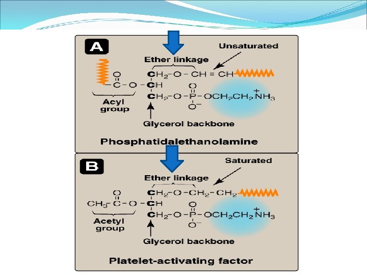 Platelet-activating factor (PAF) � PAF is an unusual ether ﺍﻳﻀﺎ ﺍﻳﺜﺮ ﺑﺮﺍﺑﻄﻪ ﻣﺮﺗﺒﻂ glycerophospholipid, with a saturated alkyl group ﻣﺸﺒﻌﻪ ﺭﺍﺑﻄﻪ ﻟﺪﻳﻬﺎ ﺍﻥ -1 ﻗﺒﻞ ﺍﻟﻠﻲ ﻋﻦ ﺗﺨﺘﻠﻒ in an ether link to carbon 1 and ﺍﻟﺜﺎﻧﻲ ﺍﻻﺧﺘﻼﻑ >>>2 - an acetyl residue (rather than a fatty acid) at carbon 2 of the glycerol backbone. PAF is synthesized and released by a variety of cell types that binds to surface receptors, triggering potent ﻗﻮﻱ thrombotic and acute inflammatory leads to hypersensitivity & anaphylactic ﻓﻌﻞ ﺭﺩﻭﺩ ﻣﻨﺎﻋﻴﻪ reactions. It causes platelets to aggregate and degranulate the neutrophils and alveolar macrophages to generate superoxide radicals that killed the bacteria. PAF is one of the most potent bioactive molecules known, causing effects at concentrations as low as 10 -12 mol/L.