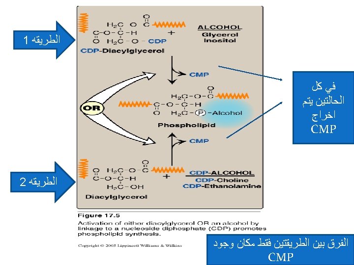 Synthesis of Phospholipid 1. Glycerophospholipid (GP) synthesis involves : ﺑـﺎﻣﺎ ﺗﺘﻢ ﺍﻟﺘﺼﻨﻴﻊ ﻃﺮﻕ either the 1 - donation of phosphatidic acid from CDP-diacylglycerol to an alcohol, or 2 - the donation of the phosphomonoester of the alcohol from CDP-alcohol to 1, 2 -diacylglycerol. CDP is cytidine diphosphate. 2. In both cases, the CDP-bound structure is considered an "activated intermediate, " and CMP is released as a side product of GP synthesis. 3. A key concept in phosphoglyceride synthesis, is activation either of diacylglycerol or the alcohol to be added by linkage with CDP. ﺍﻧﻈﺮ ﺍﻟﺮﺳﻤﻪ ﺍﻟﺼﻔﺤﻪ ﺍﻟﻘﺎﺩﻣﻪ ﺗﺮﻳﺤﻚ ﻣﻦ ﺻﺪﺍﻉ ﺍﻟﺮﺍﺱ ﻫﺬﺍ
