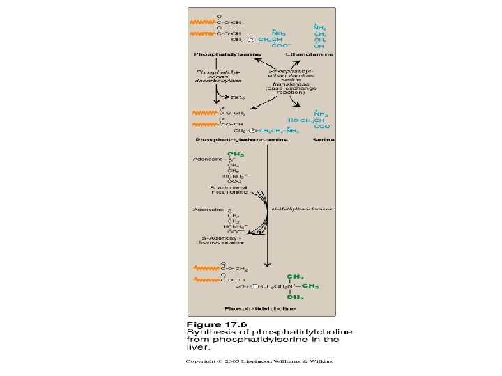 2: Synthesis of PC from phosphatidylserine (PS) in liver ﻣﻬﻢ ﺍﻟﻤﻜﺎﻥ : 1. The liver requires a mechanism for producing PC, even when free choline levels are low, because it exports ﺗﺼﺪﺭ significant amounts of PC in the bile and as a component of serum lipoproteins. 2. To provide the needed PC, PS is decarboxylated ﺍﻟﻰ ﺗﺤﻮﻝ to phosphatidylethanolamine (PE) by ﺍﻧﺰﻳﻢ ﺑﻮﺍﺳﻄﻪ PS decarboxylase, an enzyme requiring pyridoxal phosphate as a cofactor. 3. PE then undergoes 3 methylation steps to produce PC, as illustrated in Figure 17. 6. 4. S-adenosylmethionine (SAM) is the methyl group donor lead to S -adenosylhomocysteine