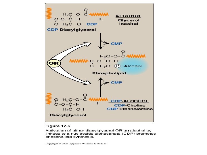 E. Phosphatidylglycerol (PG) and cardiolipin v v PG occurs in relatively large amounts in mitochondrial membranes and is a precursor of cardiolipin. It is synthesized by a two-step reaction from CDPdiacylglycerol and glycerol 3 -phosphate. v Cardiolipin (diphosphatidylglycerol, is composed of two molecules of phosphatidic acid connected by a molecule of glycerol. v It is synthesized by the transfer of diacylglycerophosphate from CDP-diacylglycerol to a preexisting molecule of phosphatidylglycerol.