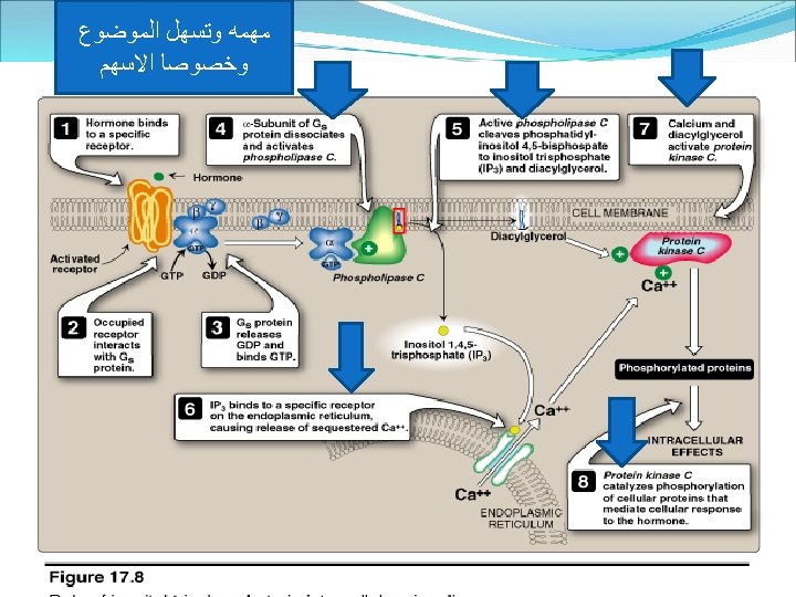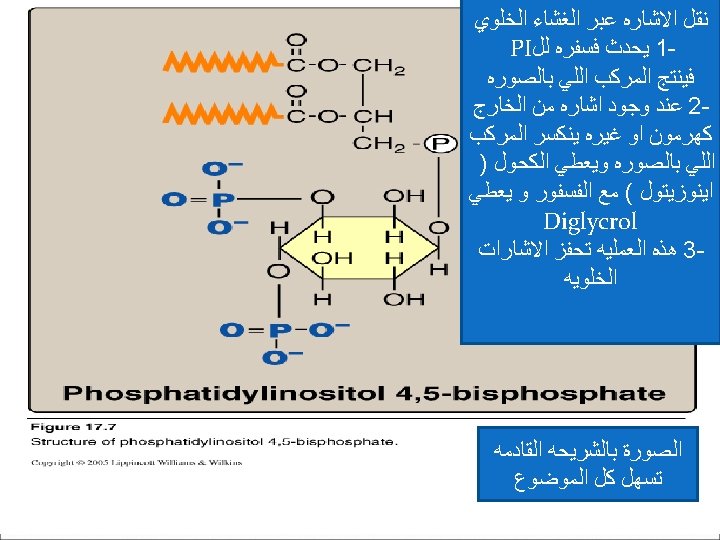 1. Role of PI in signal transmission ﺍﻻﺷﺎﺭﻩ ﻧﻘﻞ across membranes: a. The phosphorylation of membrane-bound phosphatidylinositol produces polyphosphoinositides, for example, phosphatidylinositol 4, 5 - bisphosphate (PIP 2). b. The degradation of PIP 2 by phospholipase C occurs in response to the binding of neurotransmitters, hormones, and growth factors to receptors on the cell membrane (Figure 17. 8). c. The products of this degradation, inositol 1, 4, 5 -trisphosphate (IP 3) and diacylglycerol (DAG), mediate the mobilization of intracellular calcium and the activation of PKC, which act synergistically to evoke ﻳﺴﺘﺪﻋﻲ specific cellular responses. Signal transmission across the membrane is completed.