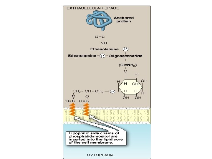 d. Being attached to a membrane lipid rather than being an integral part of the membrane) allows GPI-anchored proteins rapid lateral mobility on the surface of the plasma membrane. e. The protein can be cleaved from its anchor by the action of phospholipase C ﻣﻬﻤﻪ releasing diacylglycerol. f. A deficiency in the synthesis of GPI in hematopoietic ﺍﻟﺪﻡ ﺗﻜﻮﻳﻦ cells results in a hemolytic disease, paroxysmal nocturnal hemoglobinuria.