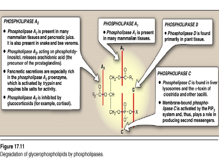 A. Degradation of phosphoglycerides a. Phospholipases hydrolyze ﻳﻜﺴﺮ the phosphodiester bonds of phospho- glycerides, with each enzyme cleaving phospholipid at a specific site. b. The major enzymes responsible for degrading phosphoglycerides are shown in Figure. c. Removal of the fatty acid from carbon 1 or 2 of a phosphoglyceride produces a lysophosphoglyceride, which is the substrate for lysophospholipases. d. Phospholipases release molecules that can serve as messengers (DAG and IP 3), or that are the substrates for synthesis of messengers (arachidonic acid).