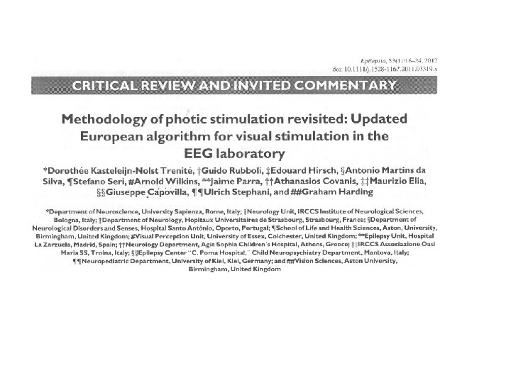 Experts Jeavons, P. M. , Harding, G. F. A. , 1975. Photosensitive epilepsy. A review of the literature and a study of 460 patients. London: William Heinemann Books. ISBN 0433172010 / 0 -433 -17201 -0 Kasteleijn-Nolst Trenité, D. G. A. , Binnie, C. D. , Harding, G. F. A. , Wilkins, A. , Covanis, T. , Eeg-lofsson, O. , Goosens, L. , Henriksen, O. , Krtimer, G. , Leyten, F. , Lopes Da Silva, F. H. , Martins Da Silva, A. , Naquet, R. , Pedersen, B. , Ricci, S. , Rubboli, G. , Spekreijse, H. , Waltz, S. , 1999 b. Medical technology assessment. Photic stimulation Standardization of screening methods. Neurophysiologie Clinique. 29 (4). 318 -324 Kasteleijn-Nolst Trenité, D. G. A. , Guerrini, R. , Binnie, C. D. , Genton, P. , 2001. Visual Sensitivity and Epilepsy: A Proposed Terminology and Classification for Clinical and EEG Phenomenology. Epilepsia. 42 (5). 692 -701. Kasteleijn-Nolst Trenité, D. G. A. , Rubboli, G. , Hirsch, E. , da Silva, A. M. , Seri, S. , Wilkins, A. , Parra, J. , Covanis, A. , Elia, M. , Capovilla, G. , Stephani, U. , Harding, G. , 2012. Methodology of photic stimulation revisited: Updated European algorithm for visual stimulation in the EEG laboratory. Epilepsia. 53(1). 16 -24.