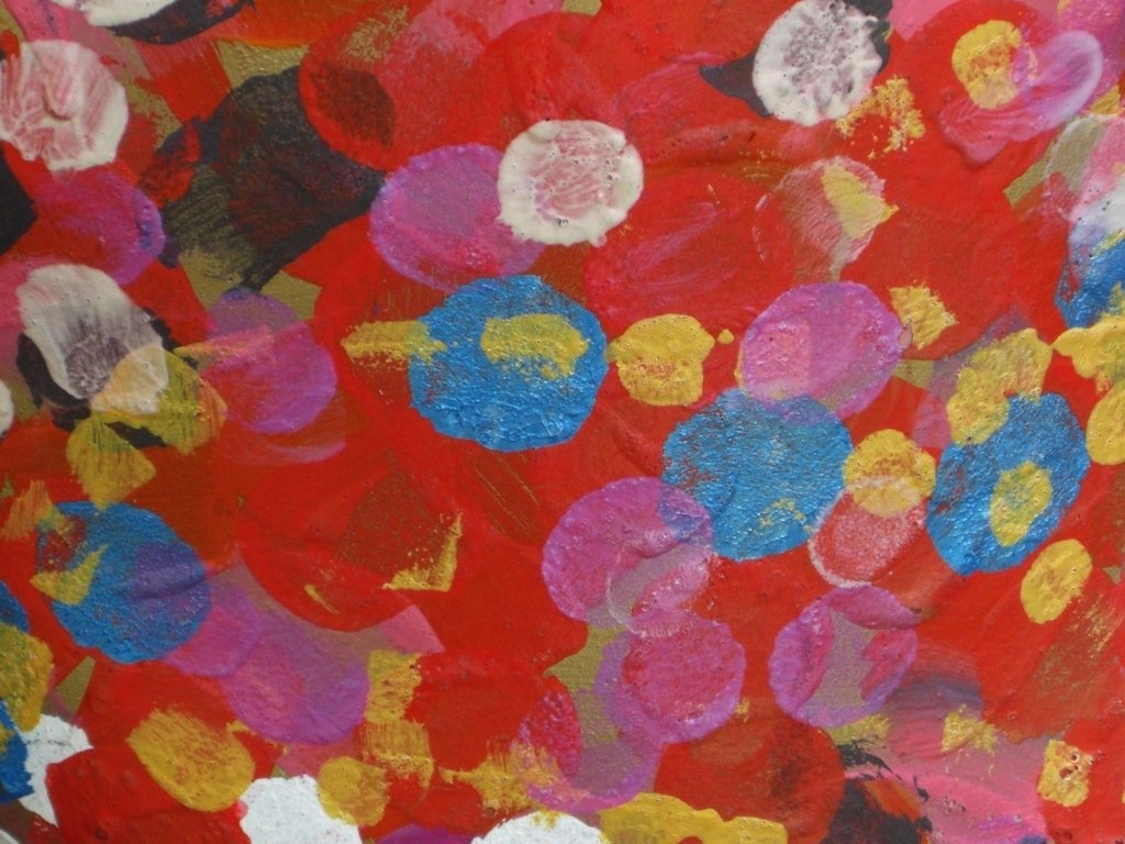 -lots going on in this picture with color -red, an extreme color that stimulates the brain, dominates picture - all of the colors are chaotic and create randomness - circles or dots are curvilinear and suggest irregularity and randomness as well - there are no implied lines or order in the picture.