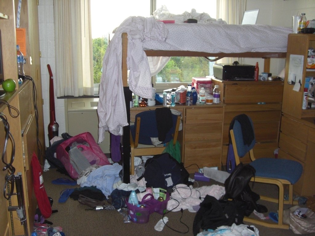 -the room is disorganized and cluttered - many different shapes are formed -the variety and randomness of objects in room show the chaos