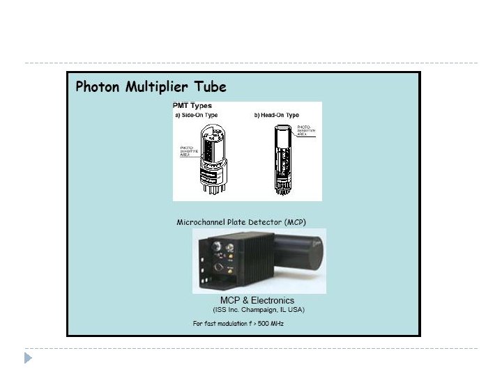 EXISTING PHOTO DETECTORS �Photomultiplier (photocathode + multiplier in vacuum tube) �Pyroelectric detector (conversion of photons to heat dielectric constant) �Semiconductor-based photoconductor (pin and APD) is suitable for optical fiber.
