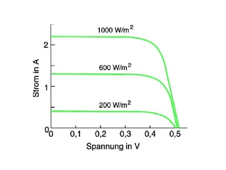 – Eigenschaften: • Abgreifbare Spannung abhängig vom Halbleitermaterial (ca. 0, 5 V bei Silizium) • Klemmspannung nur schwach von Beleuchtungsstärke abhängig • Stromstärke steigt mit zunehmender Beleuchtung (ca. 2 A bei 100 cm² großer Siliziumzelle und max. Bestrahlung von 1000 W/m²)