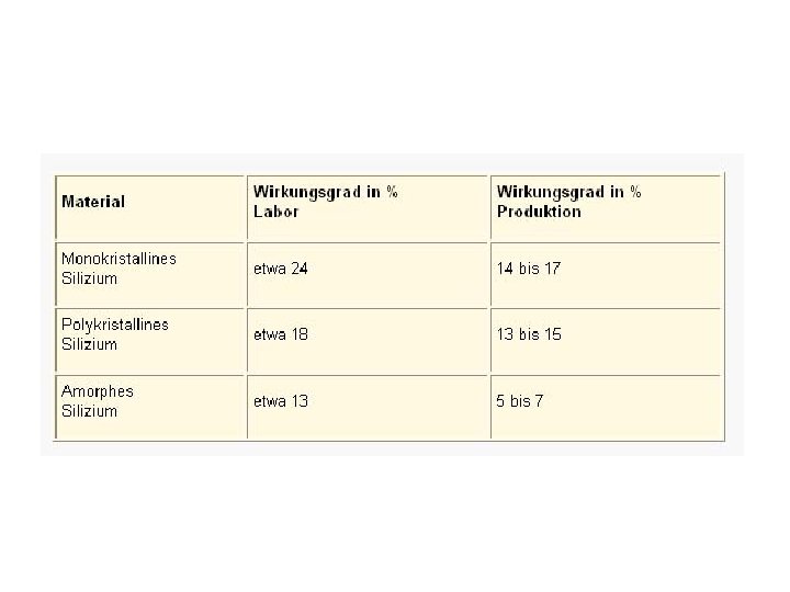 • Leistung ist temperaturabhängig (geringerer Wirkungsgrad bei hohen Temperaturen) • positive Energiebilanz (Herstellungskosten nach ca. 1, 5 Jahren getilgt)