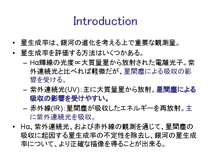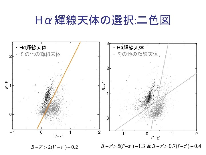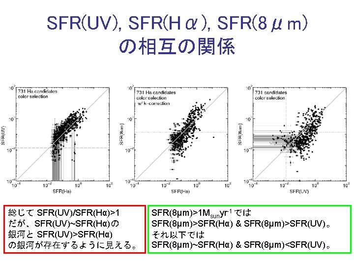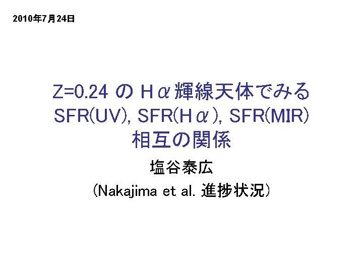 Photometric catalog Capak et al 2009 Photoz catalog Slides: 13 Download presentation カタログ • Photometric catalog Capak et al. (2009) • Photo-z catalog Ilbert et al. (2009) • Spec-z Compiled by Salvato (2008) Photometric catalog を使用する際の注意点 • Galactic Reddening と Offset (Ilbert et al. )を補正する • GALEX(UV) のデータは total magnitude • 地上望遠鏡(from U to Ks) のデータは 3”Φ total への変換には auto_offset (Capak et al)を使用 • Spitzer (NIR-MIR)のデータは 3. 8”Φ total への変換は x 1. 72 輝線天体の選択: iz-NB 816 vs. NB 816 SFR の計算(Salpter IMF) • Hα(Kennicutt 1998) • NUV(2300Å rest 1850Å) (Kennicutt 1998; Salim et al. 2007) • MIR(8μm rest 6. 5μm)(Zhu et al. 2008) Kennicutt (1998) は Solar metallicity & Salpeter IMF。Salim et al. (2007)と Kennicutt (1998) の SFR(UV) の違い、および SFR(MIR) の較正については補遺を参照 SFR(UV)/SFR(Hα)>1 の解釈(1) (星生成史による違い) Constant SFR の場合、> 10 Myr ではほぼ SFR(UV)~SFR(Hα) Simple Stellar Population では、 >5 Myr で SFR(UV)>SFR(Hα) SFR(UV)/SFR(Hα)>1の解釈(2) (SSPにおけるEW(Hα)の進化) Simple Stellar Population の場合でも、age~10 Myr では EW(Hα)>10Åである。 SFR(8μm)‐Zhu et al. (2008) • • Spitzer SWIRE field の銀河で得られた 8μm dust emission と Hα光度の間の相 関。(左) Total luminosity、(右) aperture luminosity。 それと Kennicutt (1998) の SFR(Hα) の関係から、SFR(8μm) を得た。 SFR(PAH)‐ Sargsyan & Weedman (2009) (Houck et a. 2007, Ap. J, 671, 323) • (左) 7. 7μm の flux で規格化した starburst galaxies の Spitzer IRS spectra。 • Sargsyan & Weedman (2009) では、Houck et al. (2007) の関係(右)を用いて 以下の関係を得ている。