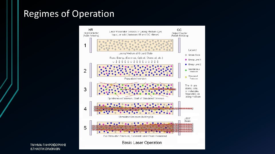Optical Transitions • If radiation with f > Eg/h is injected then absorption mechanism becomes dominant. • If population inversion occurs spontaneous emission becomes dominant • If an optical cavity is in place, optical feedback will give rise to a chain reaction of photons, allowing stimulated emission to become dominant. • Light Amplification by Stimulated Εmission of Radiation ΤΜΗΜΑ ΠΛΗΡΟΦΟΡΙΚΗΣ &ΤΗΛΕΠΙΚΟΙΝΩΝΙΩΝ 4