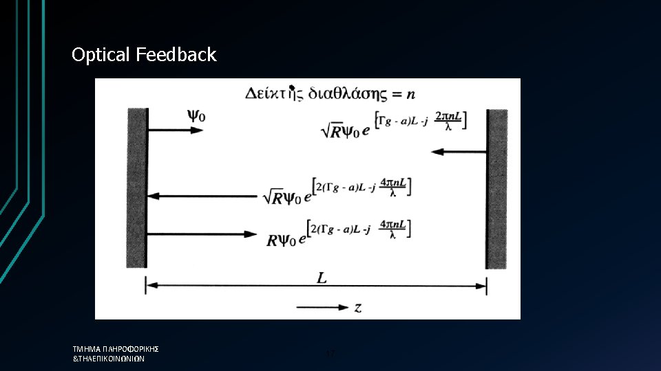 Optical Feedback • Optical power increases with pumping • Coherent nature of the effect allows the increase of power with the power of two of each contribution • One of the two mirrors should be semi-transparent • Gain should match losses • Superposition creates maxima longitudinal modes • Με απόσταση: ΤΜΗΜΑ ΠΛΗΡΟΦΟΡΙΚΗΣ &ΤΗΛΕΠΙΚΟΙΝΩΝΙΩΝ 19