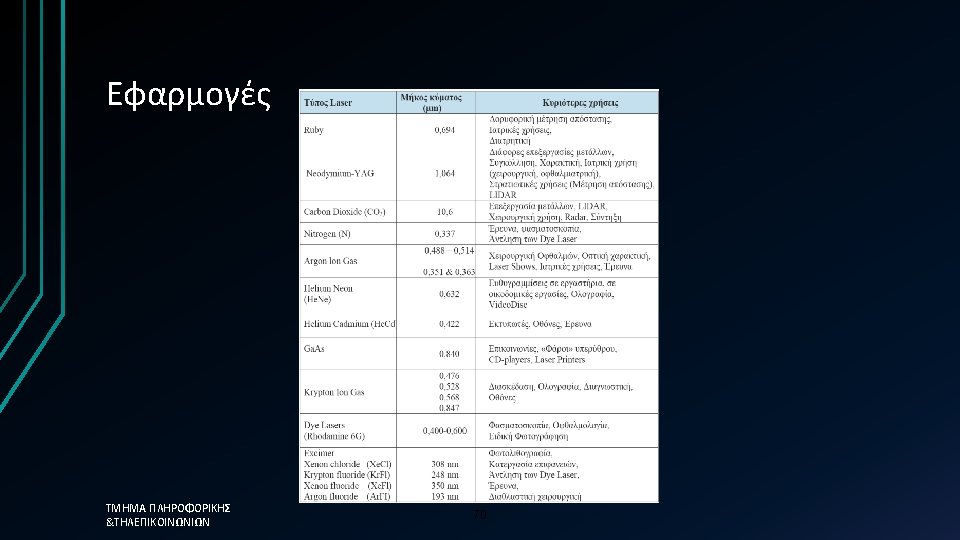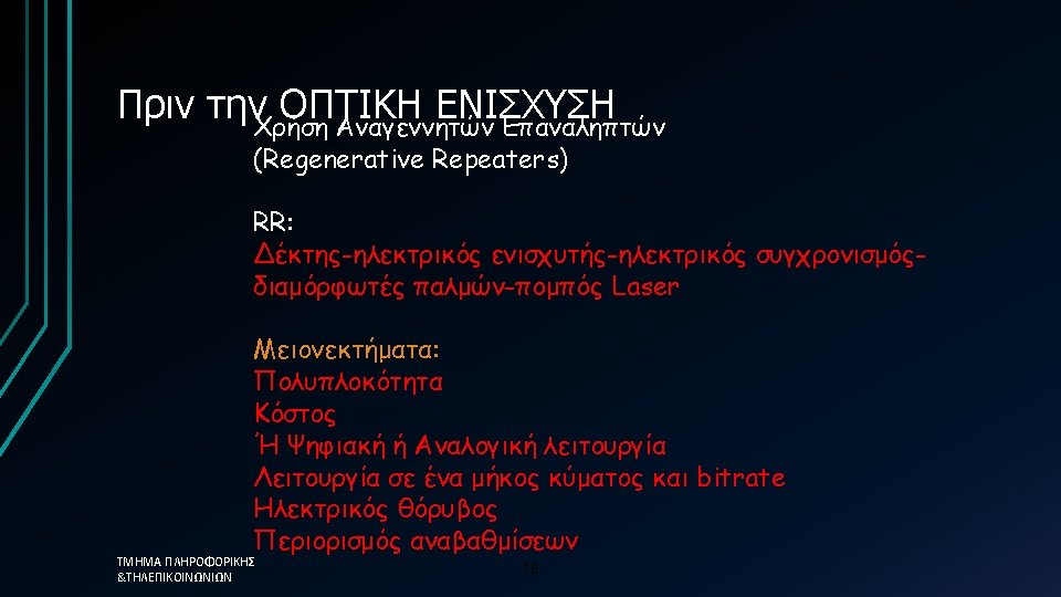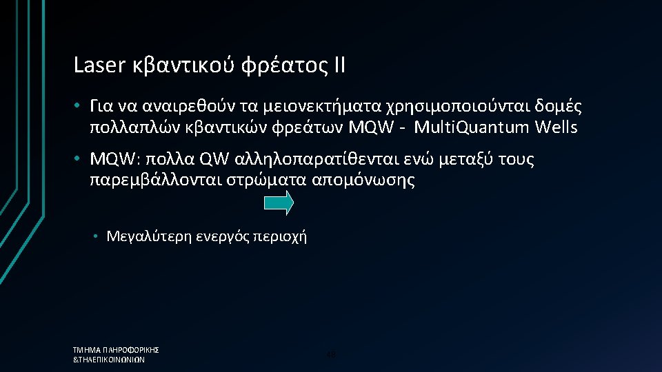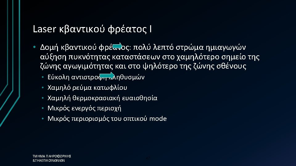 Distributed Feedback (DFB) Laser- Σύνοψη • Single longitudinal mode (SLM) spectrum • High performance telecommunication laser Most expensive (difficult to manufacture) • Long-haul links & DWDM systems • • Key characteristics • • • ΤΜΗΜΑ ΠΛΗΡΟΦΟΡΙΚΗΣ &ΤΗΛΕΠΙΚΟΙΝΩΝΙΩΝ P peak Mostly around 1550 nm Total power 3 to 50 mw Spectral width 10 to 100 MHz (0. 08 to 0. 8 pm) Sidemode suppression ratio (SMSR): > 50 d. B Coherence length 1 to 100 m Small NA ( good coupling into fiber) 46 SMSR
