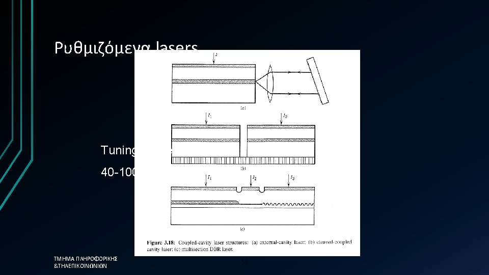 Long-wavelength VCSELs • For fiber optical communication purposes VCSELs emitting in the 1. 3 -1. 55 m region (long-wavelength) are used • It has been difficult to fabricate a monolithic semiconductor DBR for a longwavelength VCSEL. The main reason is that the difference in refractive indexes for the fabrication materials are very small, about half the difference of that used for shorter wavelength VCSEL. • There has been two approaches made to overcome this problem, the use of wafer-fused Ga. As/Al. As mirrors and the use of dielectric mirrors. Both approaches lead to very promising results • Βέβαια μέχρι σήμερα αξεπέραστο παραμένει το πρόβλημα της χαμηλής εκπεμπόμενης ισχύος ΤΜΗΜΑ ΠΛΗΡΟΦΟΡΙΚΗΣ &ΤΗΛΕΠΙΚΟΙΝΩΝΙΩΝ 52