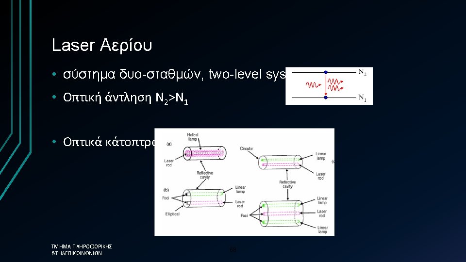 Population Inversion • If Ν 2>Ν 1 occurs by supplying energy to the optical system, then intensity increases Ι=Ι 0 exp(κx) με κ=-α>0 • Nonethless in a two level system maximum is Ν 1=Ν 2(transpartency • Therefore in order to achieve lasing a 3 -4 atomic system is required ΤΜΗΜΑ ΠΛΗΡΟΦΟΡΙΚΗΣ &ΤΗΛΕΠΙΚΟΙΝΩΝΙΩΝ 6