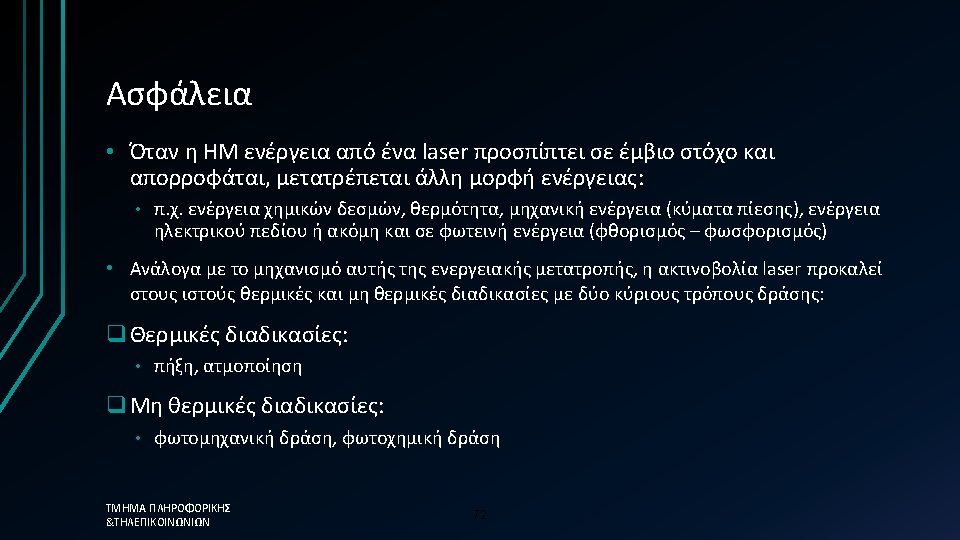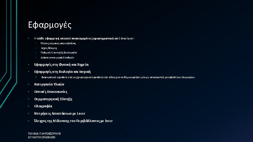 DFB Lasers Bragg grating placed in the vicinity of the active region • Feedback takes place throughout the laser cavity • Bragg condition must satisfied • Narrow linewidth operation • Wavelength tuning is possible by heating the grating • Most communication lasers are DFB lasers ΤΜΗΜΑ ΠΛΗΡΟΦΟΡΙΚΗΣ &ΤΗΛΕΠΙΚΟΙΝΩΝΙΩΝ Grating period 240 -245 nm!! • Wavelength = 2 neff 45