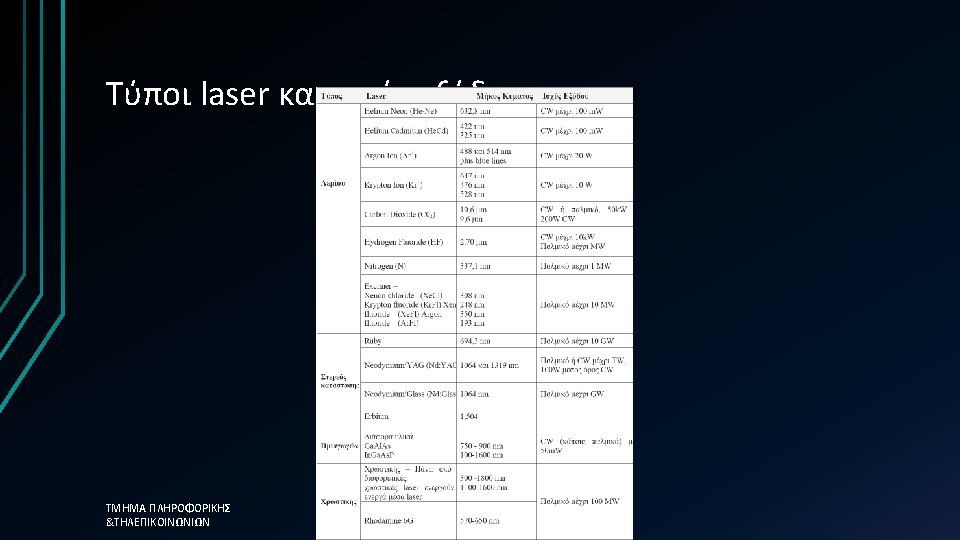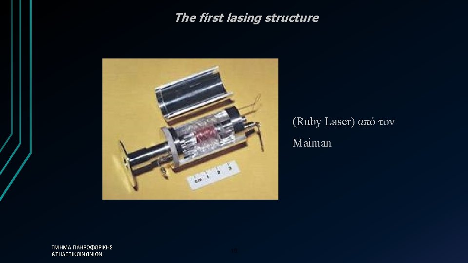 Key Events in Lasing 1916 ο Einstein explains stimulated emission 1958 οι Shawlow και Townes provide the fundamental principles of lasing 1960 o Maiman fabricates the first laser 1961 laser He-Ne (Α. Javan, W. Bennet, D. Harriott) 1962 diode laser from R. Hall 1963 Demonstration of CO 2 laser from Patel 1970 UV molecule (H 2) laser from R. Hodgson 1985 X-Ray laser from D. Mathews 1986 Ti: Sapphire laser from. Moulton 1994 Capasso developed the first quantum cascade laser 1996 VIS-blue laserαπό Ga. N (Nakamura) ΤΜΗΜΑ ΠΛΗΡΟΦΟΡΙΚΗΣ &ΤΗΛΕΠΙΚΟΙΝΩΝΙΩΝ 9