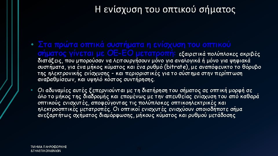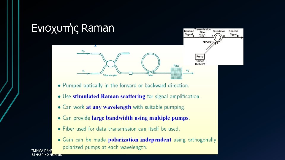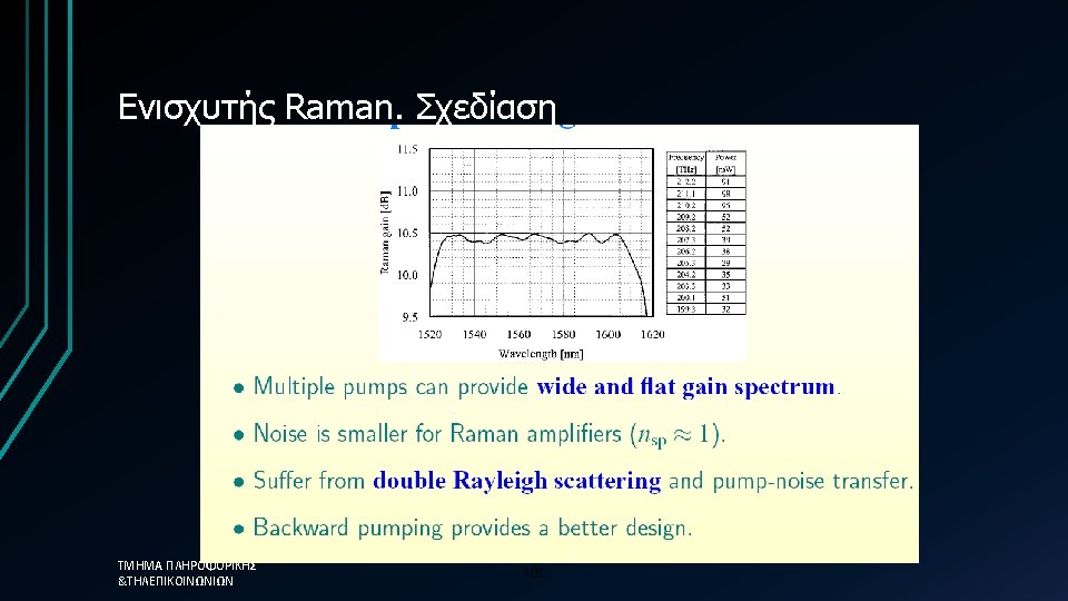 Δηλαδή. . . • Raman amplifiers: • Use stimulated Raman effect and pump laser whose frequency is equal to signal frequency plus frequency of chemical bond in the material • Because it is a nonlinear process, requires very high pump powers (watts) ΤΜΗΜΑ ΠΛΗΡΟΦΟΡΙΚΗΣ &ΤΗΛΕΠΙΚΟΙΝΩΝΙΩΝ 99