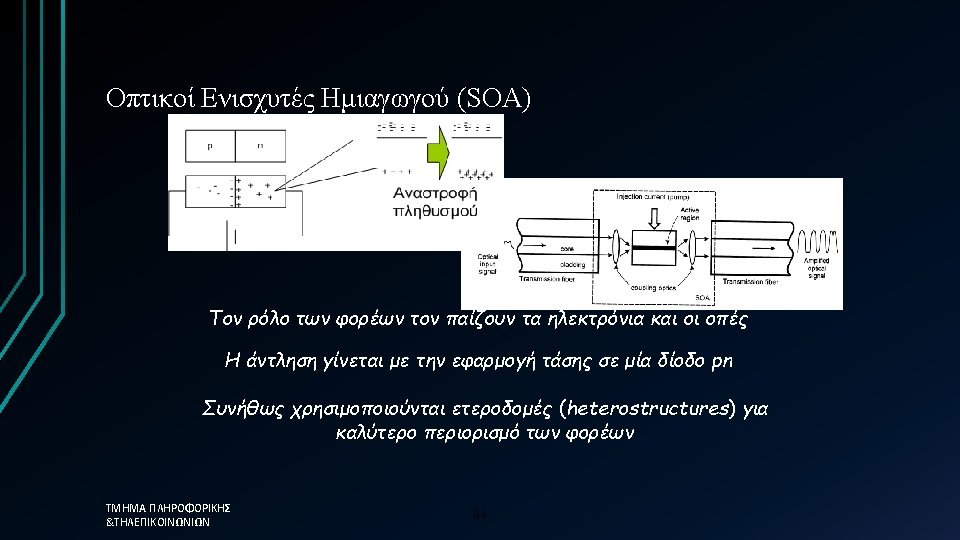 Τύποι οπτικών ενισχυτών Οι βασικοί τύποι οπτικών ενισχυτών είναι: üSemiconductor amplifiers SOA (lasers that aren’t lasing) üDoped fiber amplifiers EDFA üRaman and Brillouin Amplifiers Τα κυριώτερα χαρακτηριστικά παράμετροι: üGain and gain bandwidth üGain saturation üNoise and noise figure ΤΜΗΜΑ ΠΛΗΡΟΦΟΡΙΚΗΣ &ΤΗΛΕΠΙΚΟΙΝΩΝΙΩΝ 83