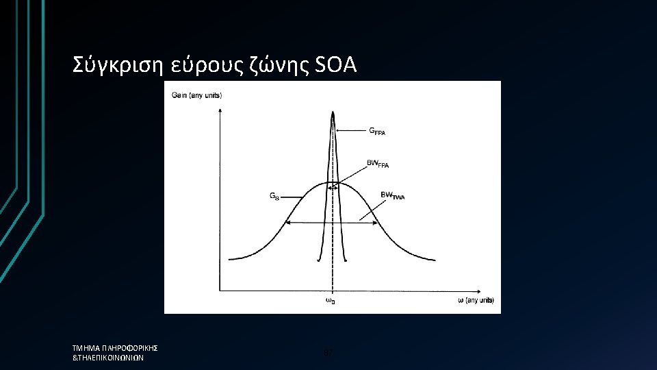 Τύποι Ενισχυτών ημιαγωγού – SOA Fabry-Perot Amplifier High gain G but non-uniform gain spectrum Traveling wave amplifier Broadband but very low facet reflectivities are needed G=G(f) Ripples are caused by the cavity modes The overall gain curve is due to the width of the atomic transition in the semi-conductor ΤΜΗΜΑ ΠΛΗΡΟΦΟΡΙΚΗΣ &ΤΗΛΕΠΙΚΟΙΝΩΝΙΩΝ 85