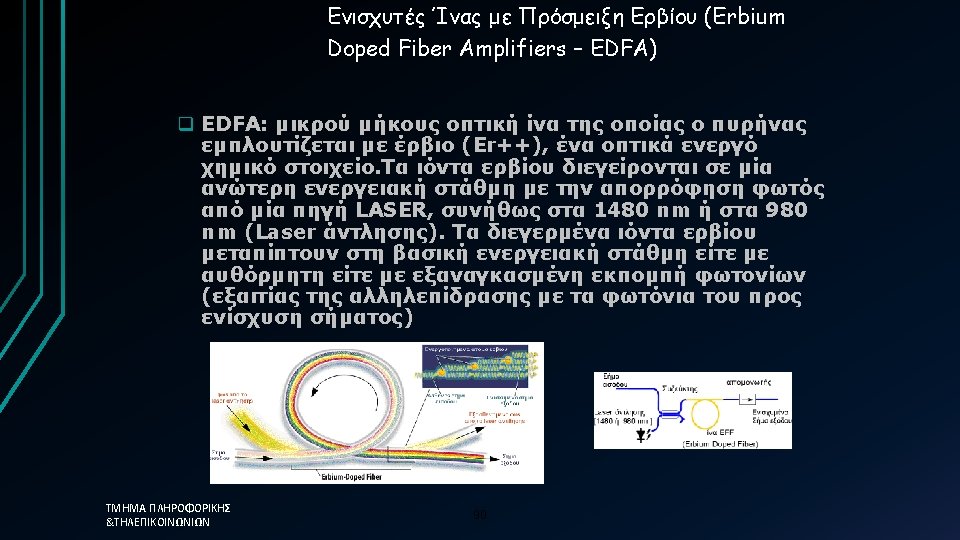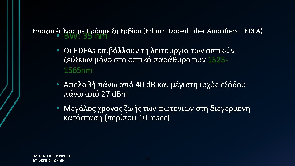 Οπτικοί Ενισχυτές Ίνας Ερβίου (EDFA) Οι φορείς είναι τα ιόντα Ερβίου Η άντληση γίνεται με LASER στα 980 nm ή στα 1480 nm. ü 980 nm pumping generates both higher gain and less noise ü 1480 nm pumping generates higher saturated power and tolerates a broader range of pump wavelengths ΤΜΗΜΑ ΠΛΗΡΟΦΟΡΙΚΗΣ &ΤΗΛΕΠΙΚΟΙΝΩΝΙΩΝ 91