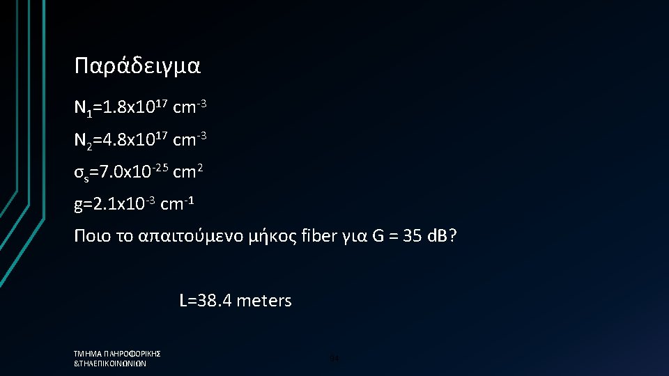 Απαιτούμενο μήκος Er-doped fiber q Gain coefficient per length g depends on population inversion and cross section for stimulated emission Overall gain G depends on g and length L: Και σε decibels: ΤΜΗΜΑ ΠΛΗΡΟΦΟΡΙΚΗΣ &ΤΗΛΕΠΙΚΟΙΝΩΝΙΩΝ 93