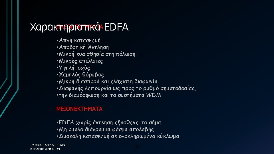Praseodymium-doped Fiber Amplifier (PDFA) • Praseodymium-doped Fiber Amplifier (PDFA) • • • Similar to EDFAs but 1310 nm optical window Deployed in CATV (limited situations) Not cost efficient for 1310 telecomm applications Fluoride based fiber needed (water soluble) Much less efficient (1 W pump @ 1017 nm for 50 m. W output) ΤΜΗΜΑ ΠΛΗΡΟΦΟΡΙΚΗΣ &ΤΗΛΕΠΙΚΟΙΝΩΝΙΩΝ 96