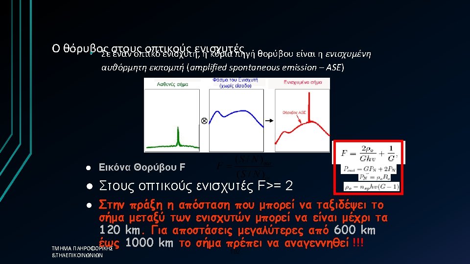 Power and noise outputs amplified power Power out: mt=number of transverse modes, Δ f=optical filter bandwidth, nspon=population inversion factor ΤΜΗΜΑ ΠΛΗΡΟΦΟΡΙΚΗΣ &ΤΗΛΕΠΙΚΟΙΝΩΝΙΩΝ 103 (ASE) noise