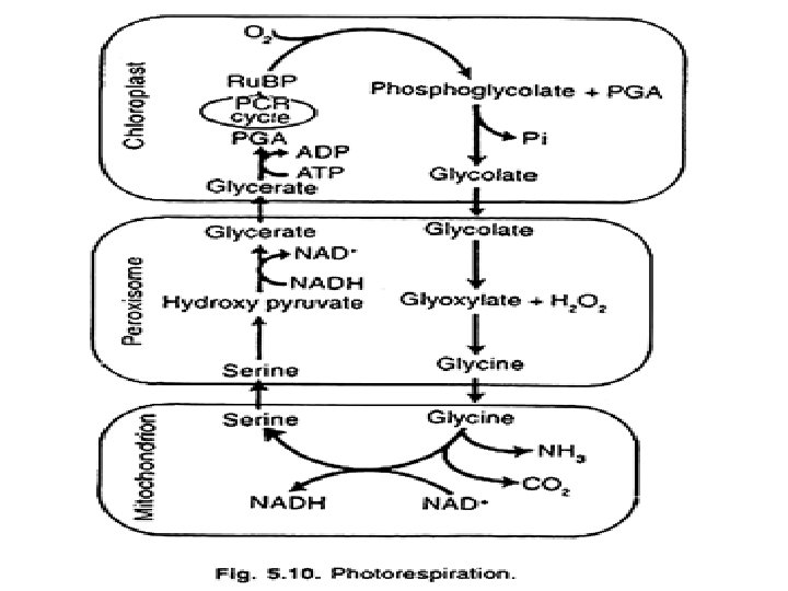 Photorespiration MECHANISM: • At mid-day, when temperature and CO 2 content are high, the affinity of Ru. BP carboxylase increases for O 2 but decreases for CO 2. Thus, it converts Ru. BP to 3 -carbon compound (PGA) and a 2 -carbon compound (phosphoglycolate) • In Chloroplast— Ru. BP+ O 2 (Ru. Bis. Co)→ 2 -Phosphoglycolic acid+ 3 -Phosphoglycerate •