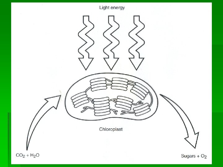 The Photosynthesis Equation light 6 CO 2 + 6 H 2 O C 6 H 12 O 6 + 6 O 2 light carbon dioxide + water glucose + oxygen