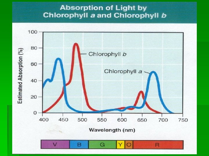 Lights and Pigments § Pigments Include: § chlorophyll a § chlorophyll b § absorbs well in red and blue but poorly in green § plants also have red , yellow and orange pigments that absorb other colors § energy is transferred to electrons in pigments when they absorb sunlight