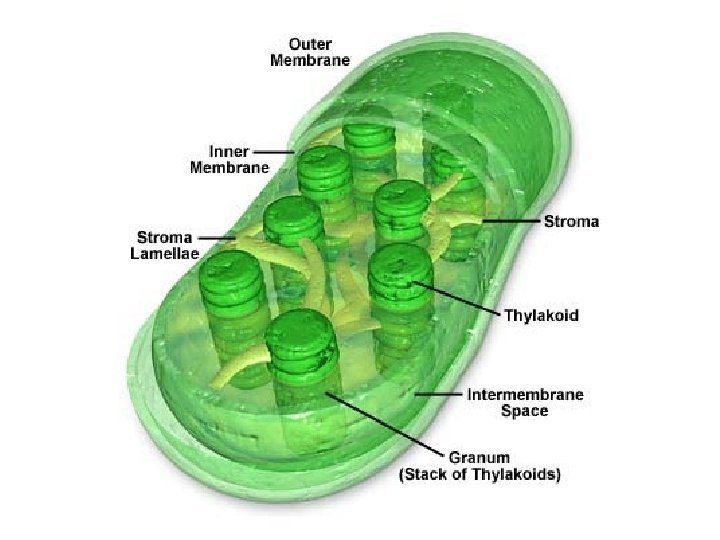 Chloroplasts • 3 main parts: • Thylakoid: – A disk-shaped structure in the chloroplast where specific reactions take place. – Looks like a quarter or a dime • Granum: – A stack of thylakoids – Plural = grana – Looks like a stack of quarters or dimes • Stroma – The cytoplasm inside the chloroplast