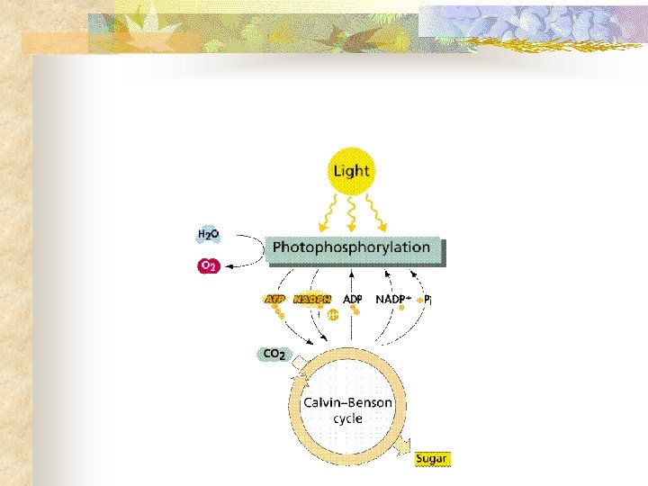 Photophosphorylation n n Addition of phosphate group to ADP Light energy