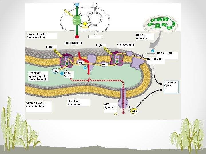 What Are the Steps of Photosynthesis? • Photosynthesis consists of both light-dependent reactions and light-independent reactions. • In plants, the so-called "light" reactions occur within the chloroplast thylakoids, where the aforementioned chlorophyll pigments reside. • When light energy reaches the pigment molecules, it energizes the electrons within them, and these electrons are shunted to an electron transport chain in the thylakoid membrane.