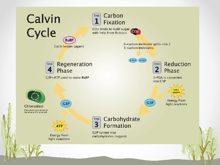 Light independent reactions • The Calvin cycle has four main steps: carbon fixation, reduction phase, carbohydrate formation, and regeneration phase. • Energy to fuel chemical reactions in this sugargenerating process is provided by ATP and NADPH, chemical compounds which contain the energy plants have captured from sunlight.