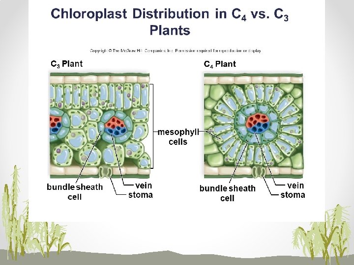 C 4 Photosynthesis • In most C 4 plants the CO 2 concentration mechanism is achieved by a division of labor between two distinct, specialized leaf cell types, the mesophyll and the bundle sheath cells, although in some species C 4 photosynthesis functions within individual cells. • Since Rubisco can operate under high CO 2 concentrations in the bundle sheath cells, it works more efficiently than in C 3 plants.