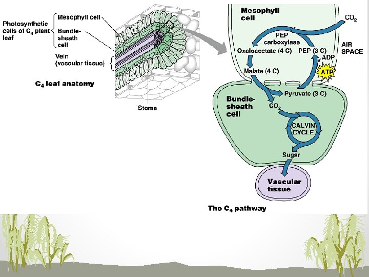 C 4 Photosynthesis • Photorespiration is not only energy demanding, but furthermore leads to a net loss of CO 2. • Thus the efficiency of photosynthesis can be decreased by 40% under unfavorable conditions including high temperatures and dryness