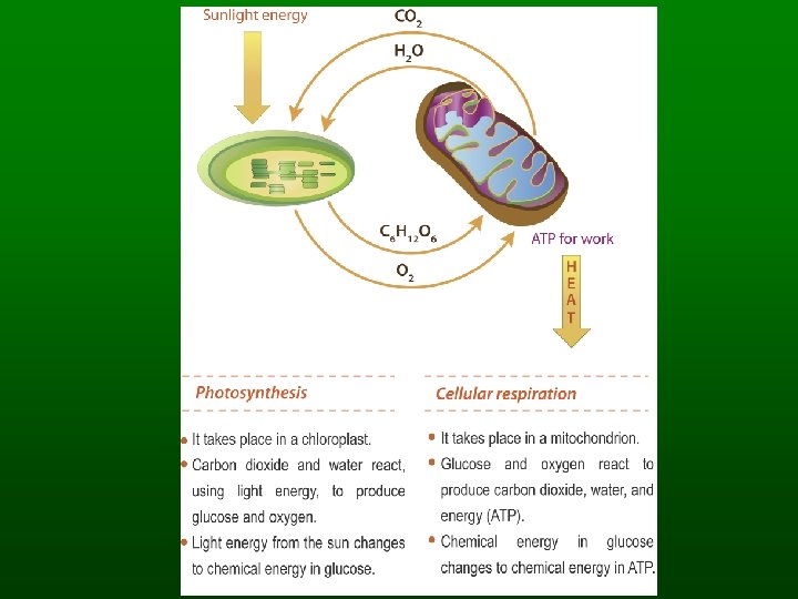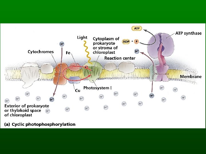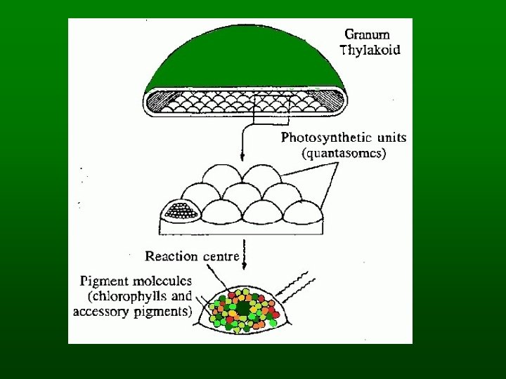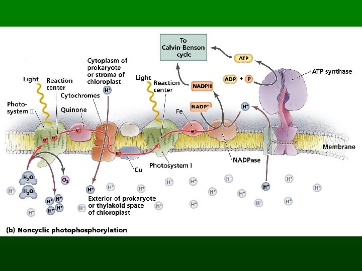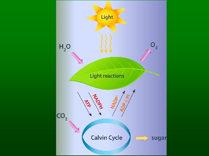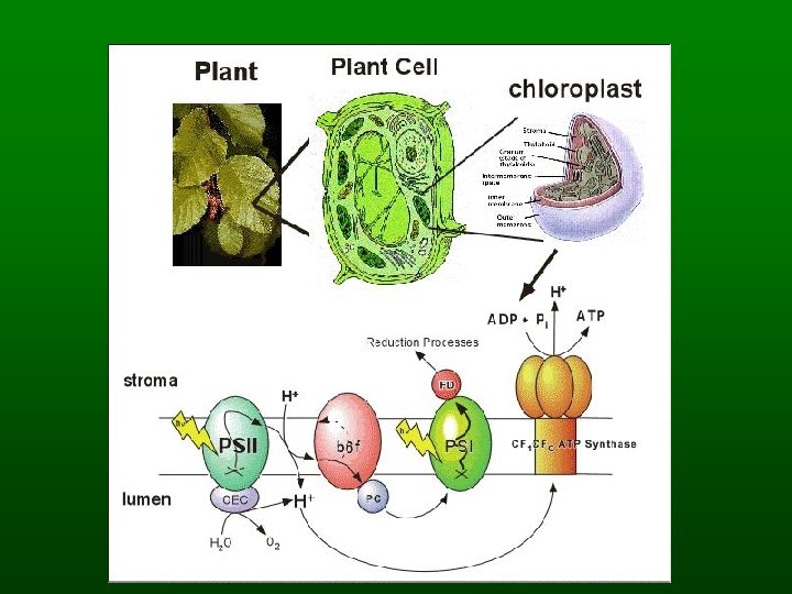 The Energy-Capturing Reactions n Light absorption – Chlorophyll a and b are antennae pigments n Electron transport – Electrons lost by chlorophyll a end up at NADP – Produce oxygen n Chemiosmotic ATP synthesis – Powered by H ion reservoir