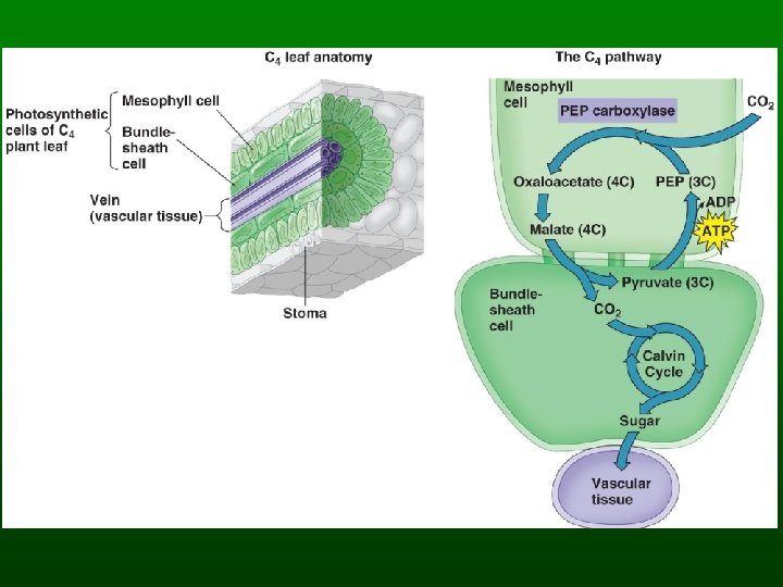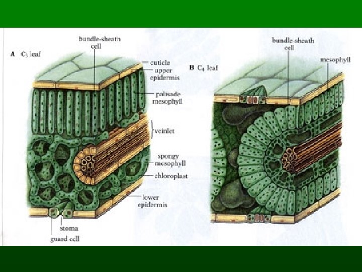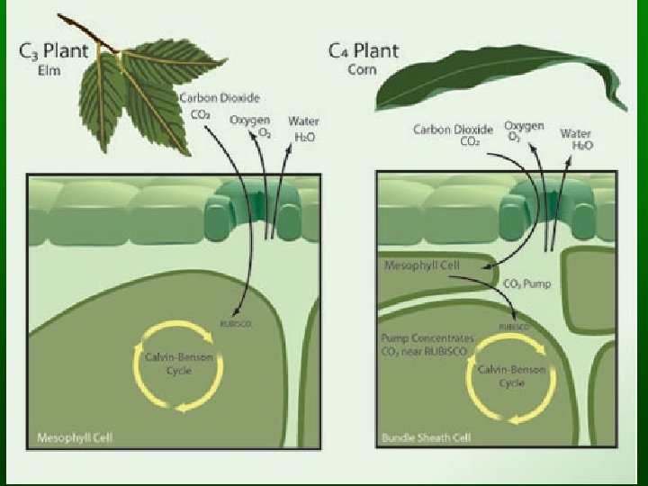 Ecological Aspects • C 4 PLANTS - Use more ATP but at high temperatures they can photosynthesize faster allowing plants to grow and reproduce faster. These include many weeds and important crops such as corn. • A special variation of C 4 plants are the CAM plants. These are mostly desert plants. These plants keep the stomata closed during the day and open at night. They must conserve water!
