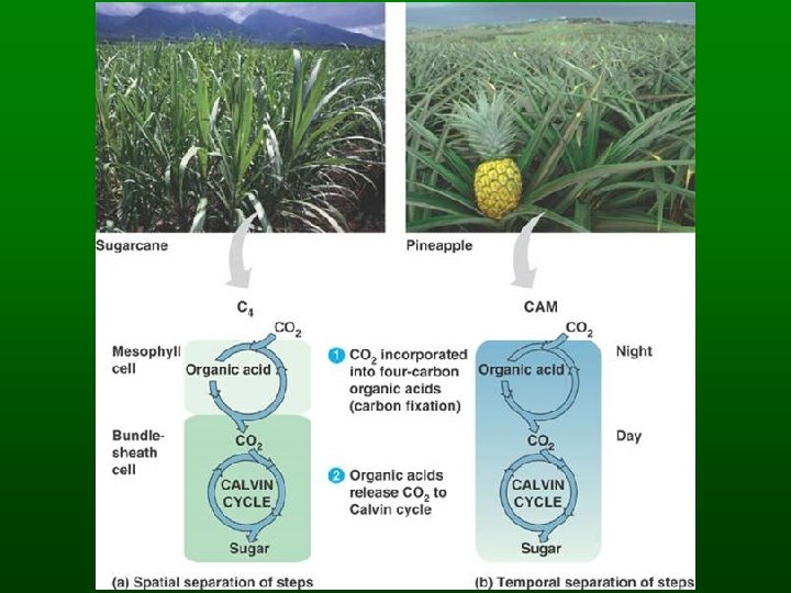 Photosynthesis - CAM Pathway Succulent plants (like cacti) Crassulacean acid metabolism (CAM) use BOTH C 3 and C 4 pathways C fixed by PEP carboxylase in DARK allows plants to close stomata product is used in same cells must have HUGE vacuoles to store C the key to the CAM pathway: temporal separation allows internal cycling during drought pineapple is CAM