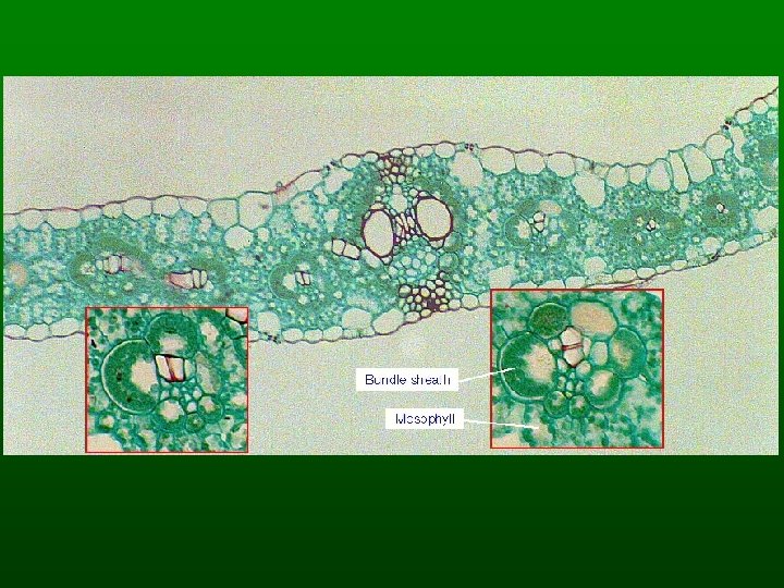 Photosynthesis - C 4 Pathway “Warm season” plants many native prairie grasses 1 st product contains 4 carbons use BOTH C 3 and C 4 pathways C fixed by PEP carboxylase in mesophyll prefers CO 2 over O 2 handles photorespiration problems product is shipped to bundle sheath cells Kranz anatomy the key to the C 4 pathway: spatial separation