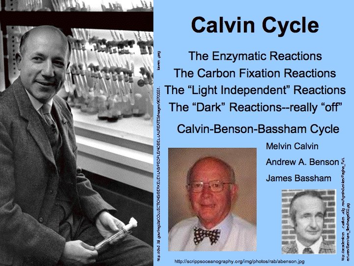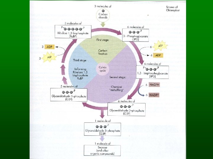 The Dark Reactions • The dark reactions take place outside thylakoid membrane. • Carbon fixation - The carbon dioxide is incorporated into an organic molecule (1 C + 5 C = 6 C). This 6 carbon structure is unstable and immediately splits into 2, 3 carbon molecules. These molecules go through a series of reactions known as the CALVIN CYCLE.