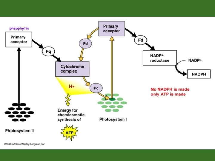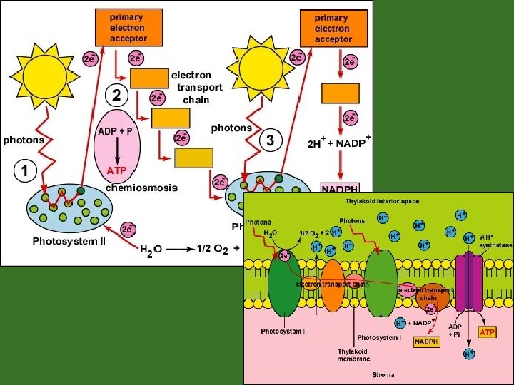 Enzyme extracts electrons from H 2 O and supplies P 680 electrons ii) iii) iv) This splits H 2 O molecule (2 H+ ions and ½ O O 2) Each photoexcited electron moves from the primary electron acceptor of Photosystem II to Photosystem I via an electron transport chain ATP is synthesized by photophosphorylation (ATP made by light) and chemiosmosis