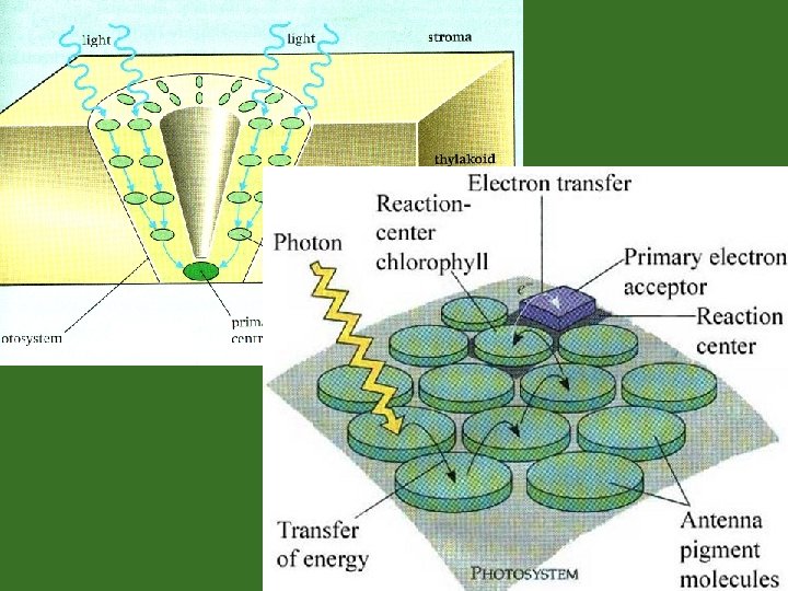 Pathway of energy: Photon (light) to pigments (chlorophyll b and carotenoid) chlorophyll a reaction centre primary electron acceptor