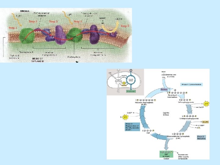 B. Aliran Elektron Nonsiklik • Berlangsung di Thyllakoid membran • Menggunakan PS II dan PS I • P 680 pusat reaksi (PSII) – klorofil a • P 700 pusat reaksi (PS I) – klorofil a • Menggunakan rantai Transport Elektron • Menghasilkan O 2, ATP dan NADPH
