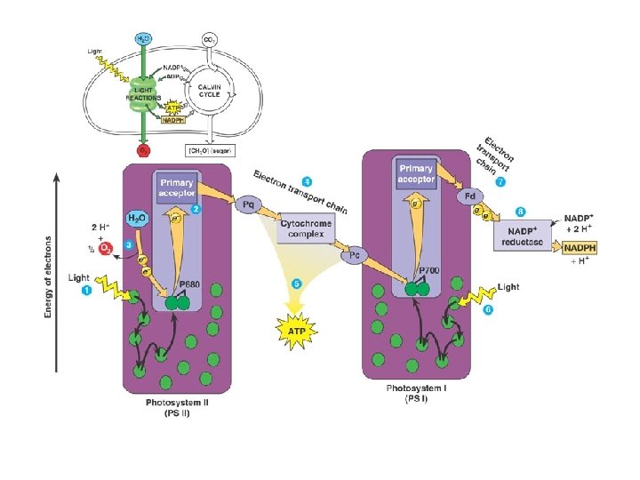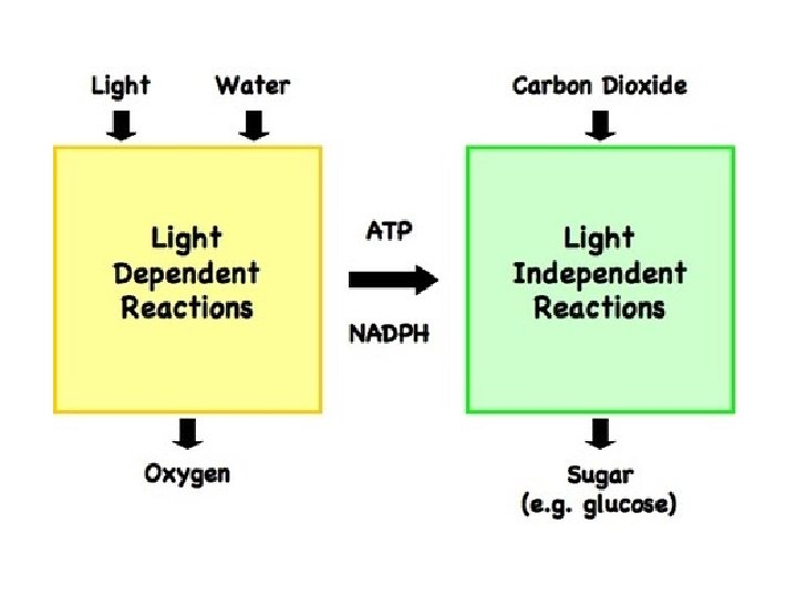 I. Light-dependent reactions Goal of rxns: Trap sunlight energy convert into chemical energy needed for Calvin Cycle. o. Requires light o Sunlight hits chlorophyll and energy is passed along membranes. o. Occurs in thylakoid membrane o. Water is broken down into H ions & electrons and oxygen gas is released o. NADPH AND ATP are made II. Light-independent reactions, or Calvin cycle. § Does not require light, but can occur if light is present §Occurs in stroma §Goal of rxns: Use chemical energy from light reactions to produce stable, high-energy sugars (glucose) from carbon dioxide and water.