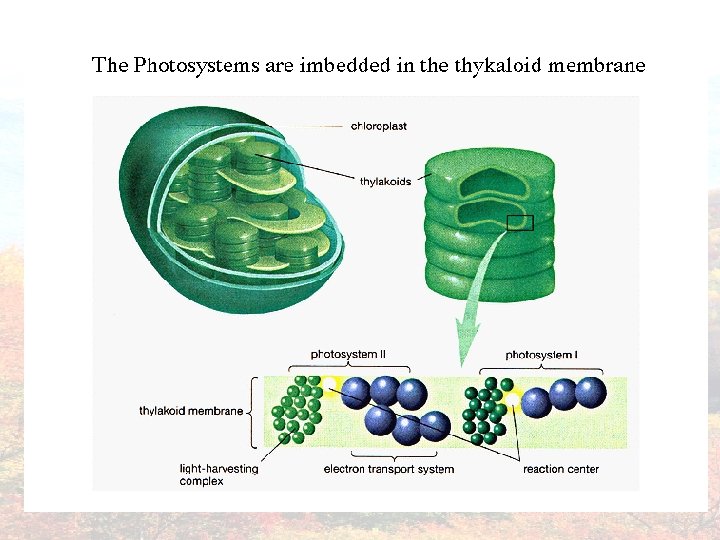 Pigments • Photosynthetic organisms capture energy from sunlight with pigments • These pigments are embedded in the membranes of the chloroplast in groups called photosystems.