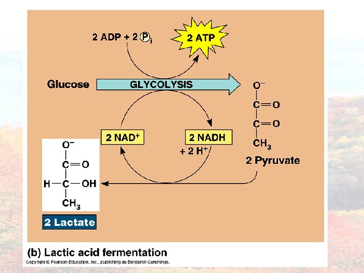Lactic Acid Fermentation • Pyruvic acid is converted into lactic acid – NADH to convert pyruvic acid to lactic acid – H+ taken from NADH makes NAD+ • used again for glycolysis