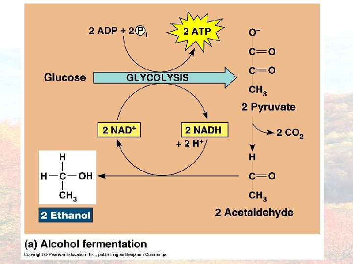 Alcohol Fermentation • Pyruvic acid converted into ethyl alcohol in two steps – 1. CO 2 removed from pyruvic acid • Uses NADH – 2. H+ from NADH is transferred to make ethyl alcohol • Used again in glycolysis • Enzymes break down glucose into ethanol and CO 2.